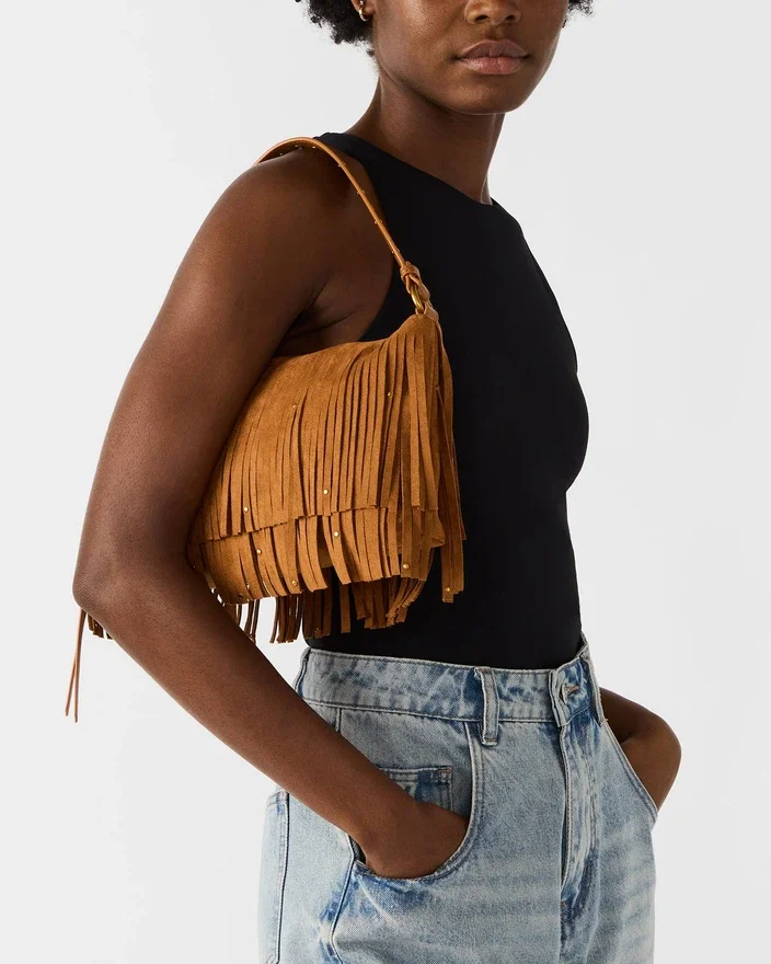 Experimente a combinação perfeita de estilo e funcionalidade com a nossa bolsa Boheme com alça de ombro em cor tabaco. O design com franjas acrescenta um toque boémio, enquanto a bolsa interior e o fecho de correr na parte superior garantem uma organização prática e um armazenamento seguro. Eleve o seu estilo com este acessório indispensável.