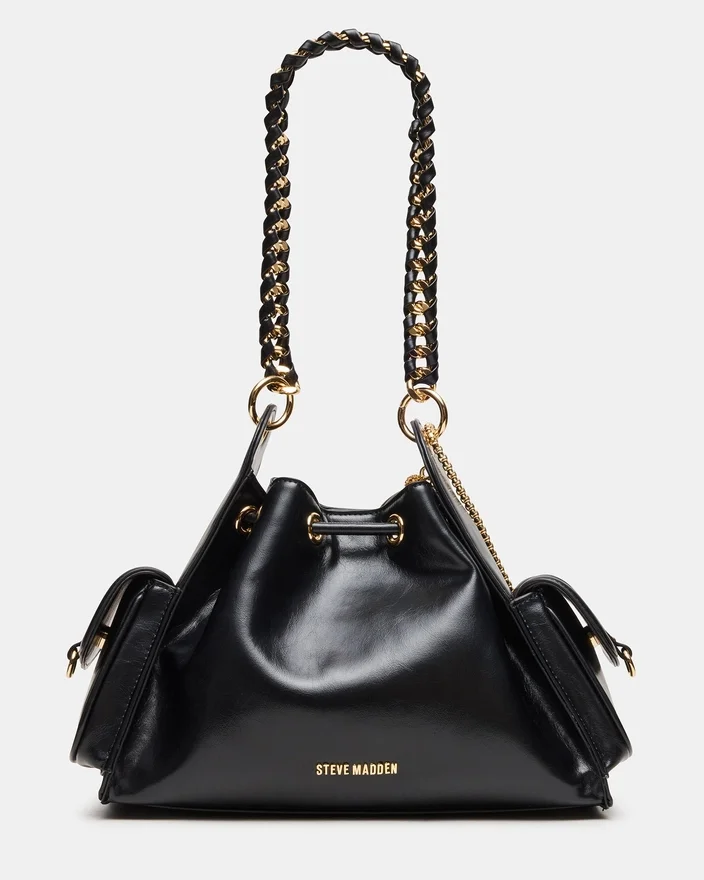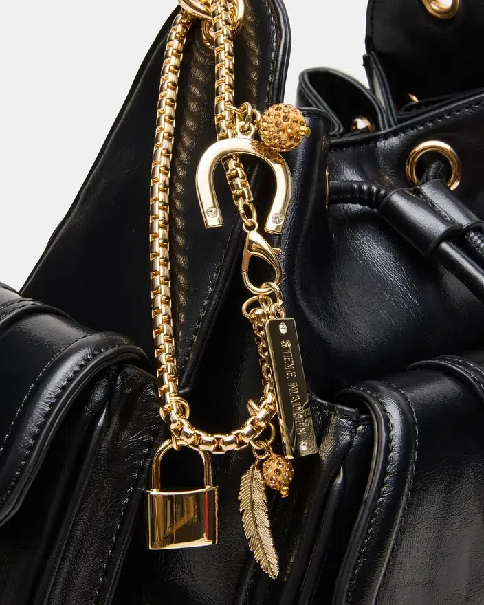 Uma mala Dru Black combina sofisticação estruturada com um toque boémio. Esta mala com formato de balde apresenta um bolso funcional com aba frontal e uma alça de corrente ajustável para um transporte versátil. O elemento de destaque é o conjunto de pingentes boho removíveis — ferradura, pena e cadeado — que lhe permitem personalizar o seu visual e expressar o seu estilo pessoal. Perfeita para quem aprecia tanto o requinte como a personalidade nos seus acessórios do dia-a-dia.