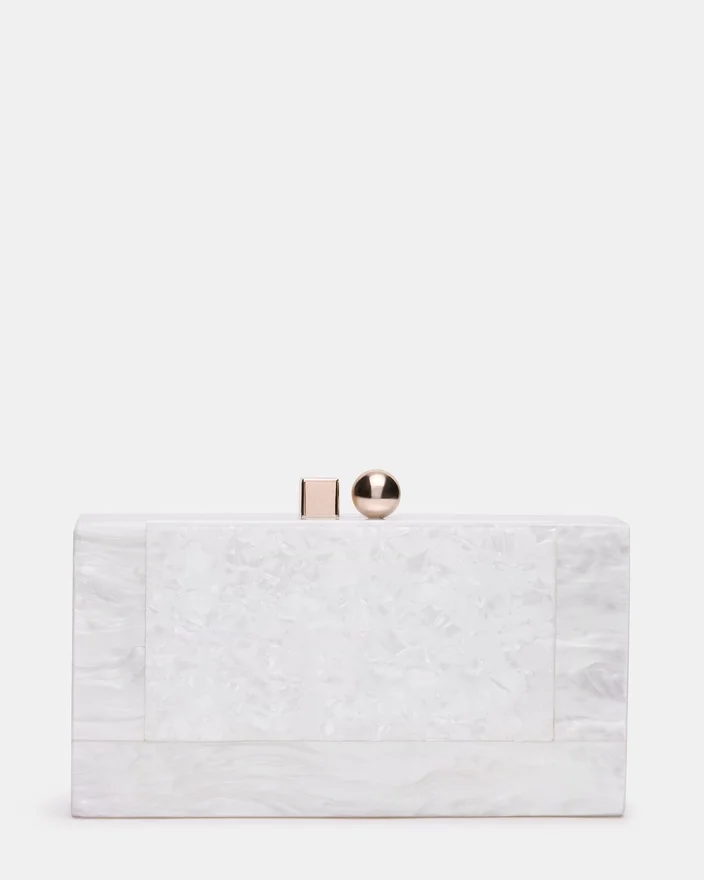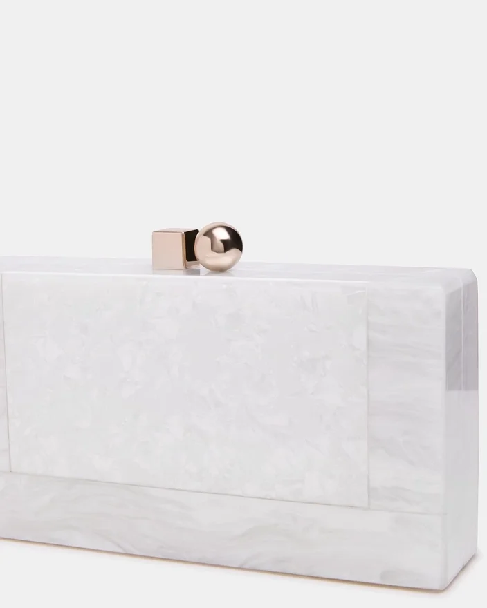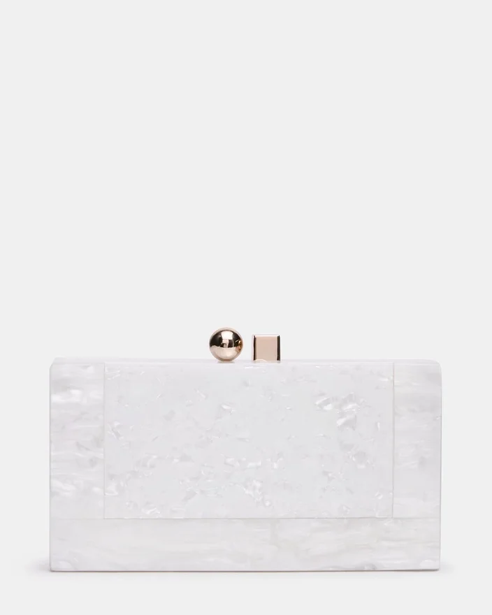 A Bolsa Camilaa Branca combina elegância sofisticada com versatilidade prática. Confecionada em imitação de madrepérola brilhante com acabamento perolado, esta minaudière apresenta um fecho metálico geométrico marcante que confere um toque contemporâneo. O design estruturado da mala rígida protege os seus itens essenciais, mantendo uma silhueta refinada, perfeita para ocasiões noturnas ou para usar durante o dia em ocasiões elegantes. No interior, um forro padrão e um compartimento para cartões mantêm os itens necessários organizados e acessíveis. A alça transversal de corrente incluída oferece versatilidade de estilo — use-a como uma clutch ou use-a com as mãos livres para uma transição fácil de um evento para outro.