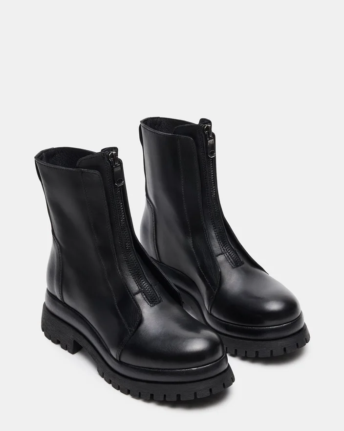 Uma bota de cano curto Milton em couro preto apresenta um design elegante inspirado no estilo motoqueiro com uma construção em couro resistente. Este botin combina uma estética robusta com um acabamento requintado, oferecendo estilo e conforto duradouro. A sua sola resistente garante uma tração fiável, tornando-a a escolha ideal para quem procura um calçado ousado, mas prático.