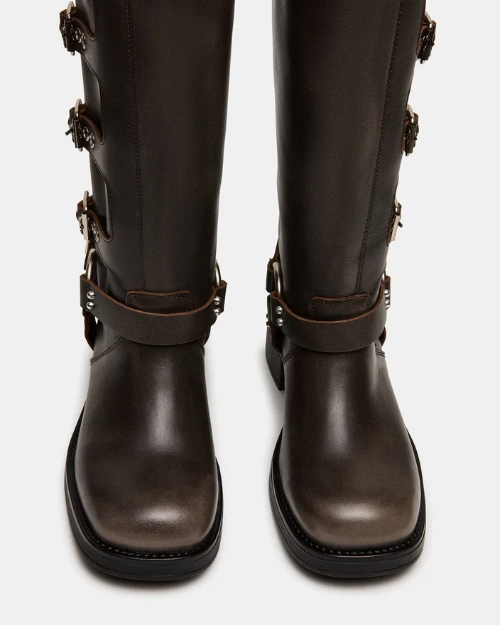 As botas de cano largo Rocky Brown, em pele envelhecida e com perna larga, apresentam o perfil largo de uma bota de engenheiro, com correias e fivelas que conferem um toque industrial e permitem um ajuste personalizável. 12,5 polegadas de altura da cana