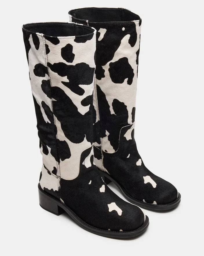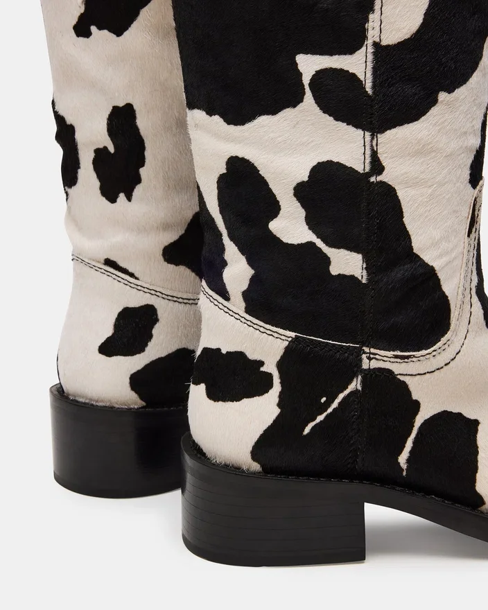 Eleve o seu estilo sem esforço com a bota Riggs com estampa de vaca preta e botas de cano largo. Com a sua biqueira quadrada e design elegante, esta bota logo abaixo do joelho é um item indispensável para qualquer pessoa que se preocupe com a moda. Esta bota intemporal oferece conforto e sofisticação, tornando-a o complemento perfeito para qualquer look.