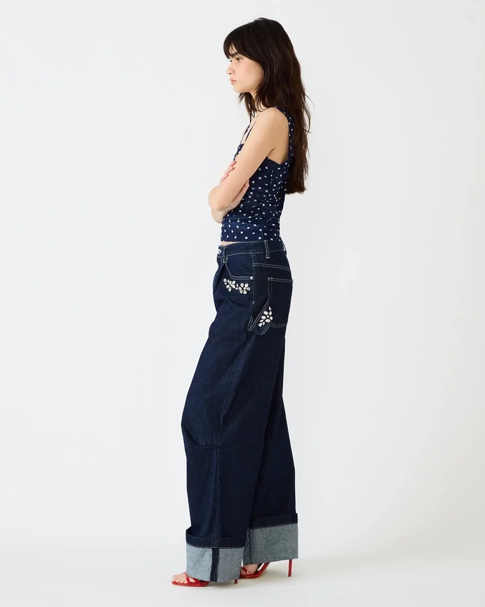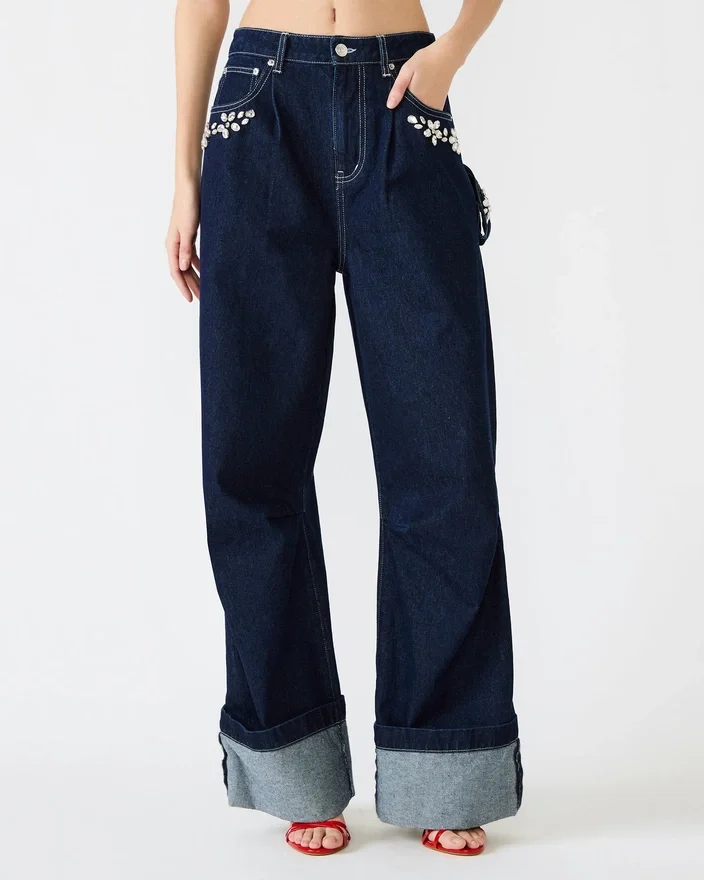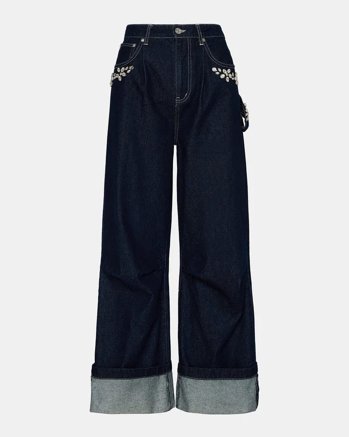 Eleve o seu estilo em ganga com as Bobbie Jean Bijou Blue. Estas partes de baixo de ganga de perna larga apresentam deslumbrantes enfeites de strass que refletem a luz a cada passo, adicionando um toque de glamour ao seu look diário.