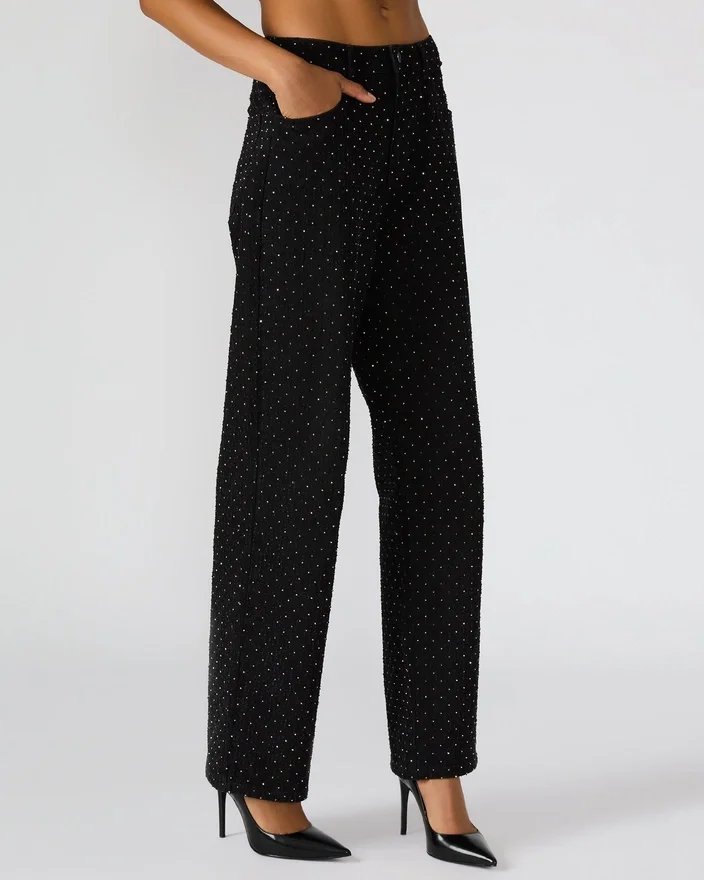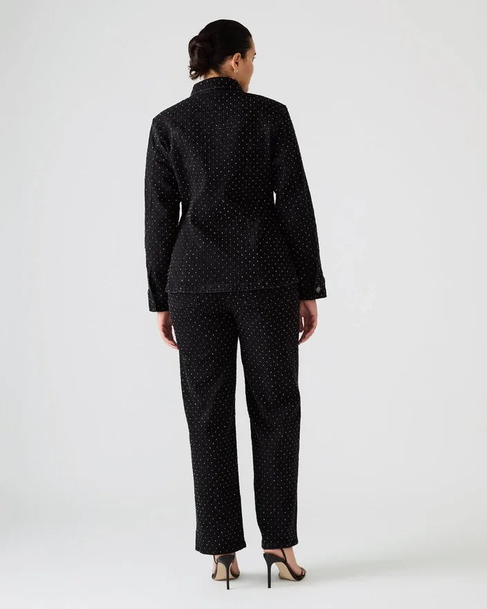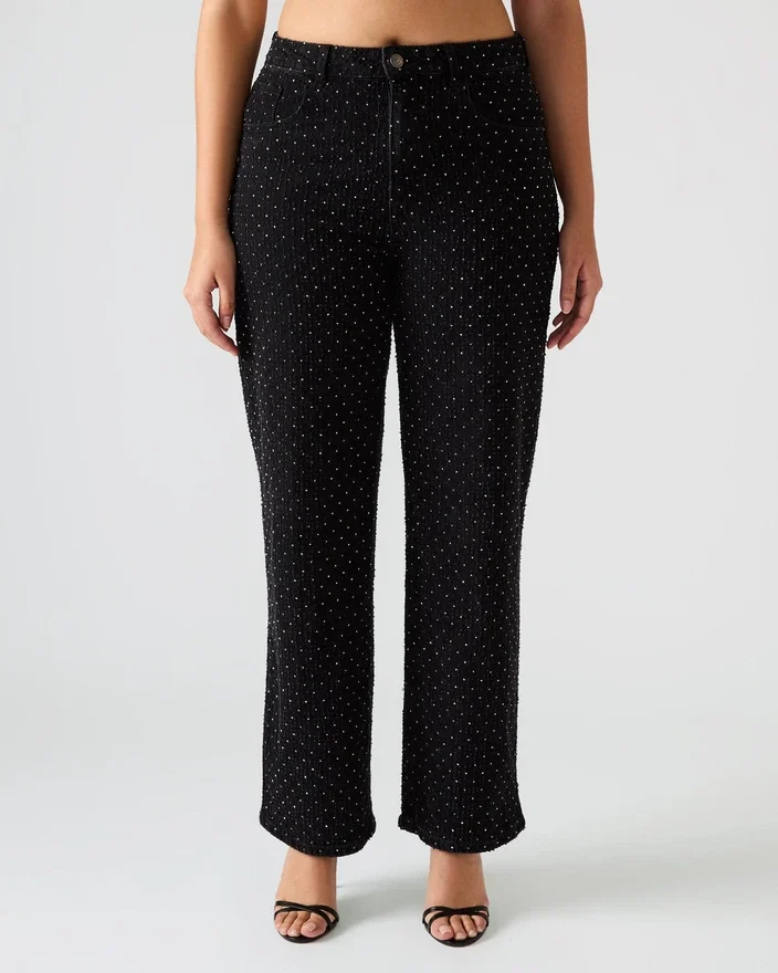 Estas calças de ganga pretas Avaline Crystal, de corte reto, apresentam um acabamento elegante realçado por detalhes em strass meticulosamente colocados, conferindo um brilho requintado ao seu guarda-roupa. Concebidas com bolsos práticos à frente e atrás, combinam um estilo vanguardista com a funcionalidade do dia-a-dia. Perfeitas para elevar looks casuais com um toque de sofisticação.