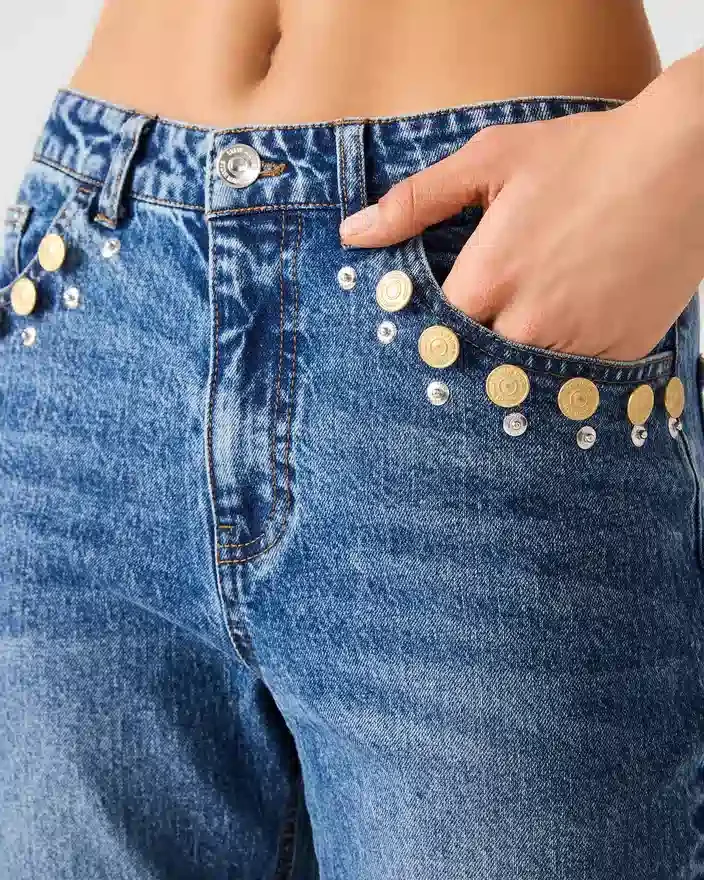 As calças Irys Jean Dark Navy apresentam uma silhueta intemporal com um toque contemporâneo. Estas calças de cintura alta e perna larga apresentam um corte lisonjeador que alonga a perna, mantendo uma estética refinada. Os bolsos funcionais à frente e atrás oferecem arrumação prática, enquanto os botões dourados exclusivos realçam o design geral com um toque de luxo. Uma peça versátil e essencial que transita facilmente do look diurno para o noturno.
