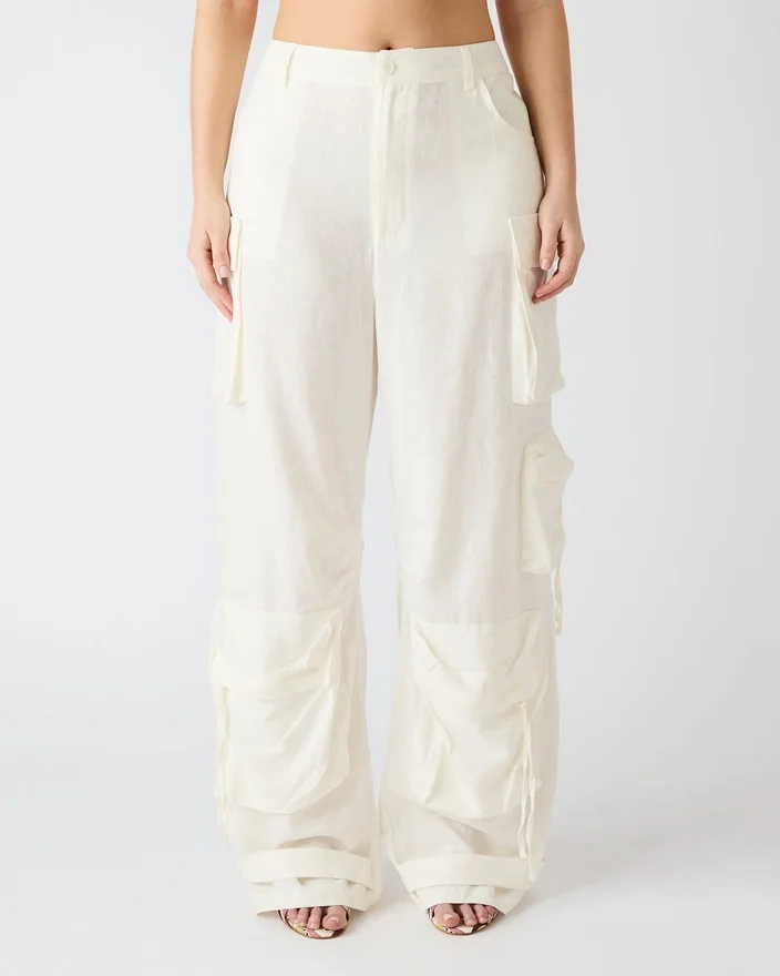 - Dois bolsos laterais, dois bolsos de remendo traseiros e cinco bolsos cargo ao longo das pernas