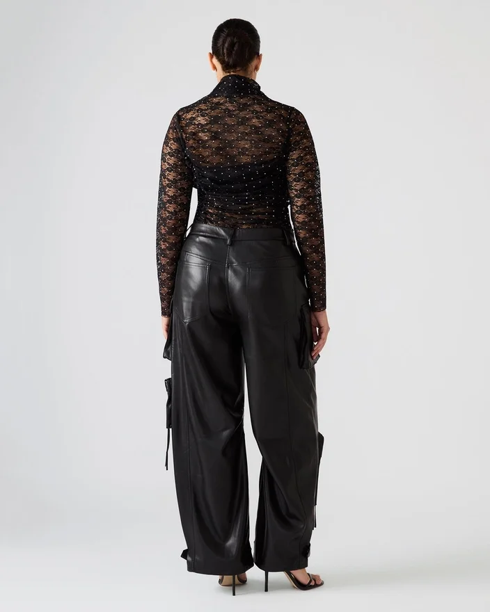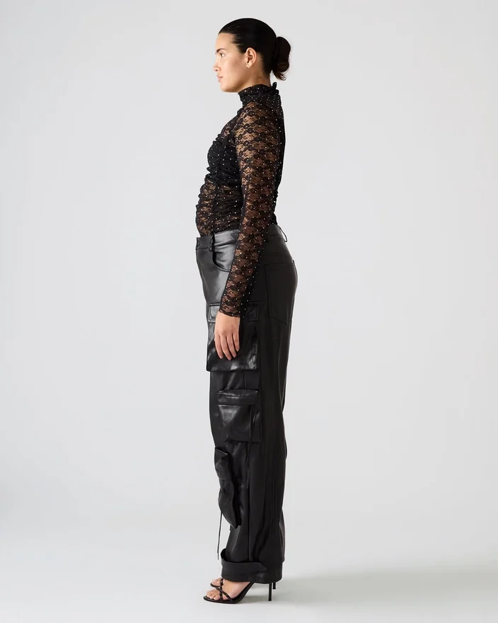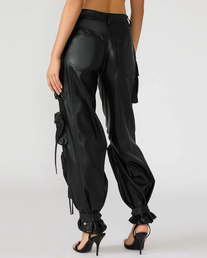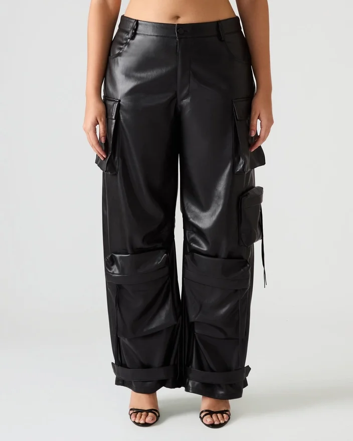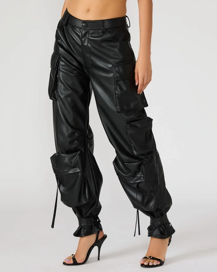 Habilmente concebidas para um corte estruturado e volumoso, as calças Duo em couro vegan preto são confecionadas com materiais de qualidade. Com tiras ajustáveis nos tornozelos, estas calças cargo de perna larga oferecem uma silhueta versátil que pode ser facilmente personalizada de acordo com a sua preferência.