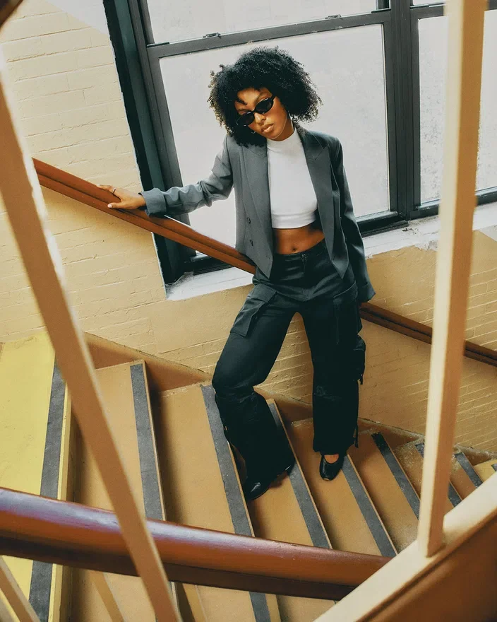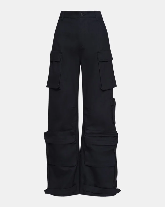 - Os três bolsos cargo inferiores apresentam puxadores de fecho prolongados