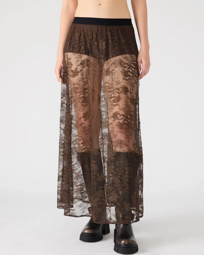 Eleve o seu guarda-roupa com a Saia Gisela, uma saia maxi de renda transparente que combina elegância com sofisticação moderna.