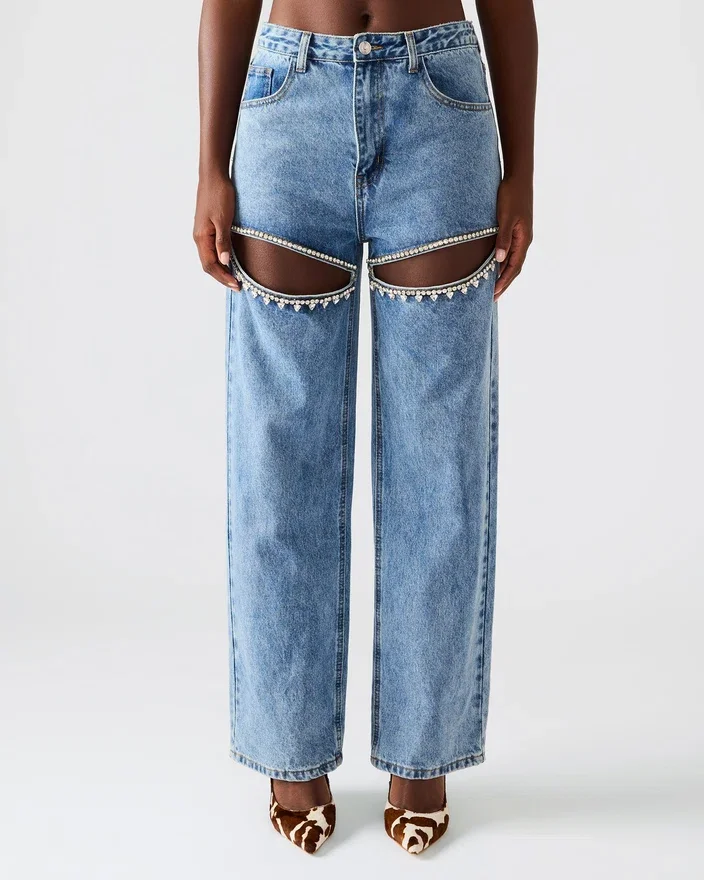 - Calças de ganga de perna larga com aberturas decoradas