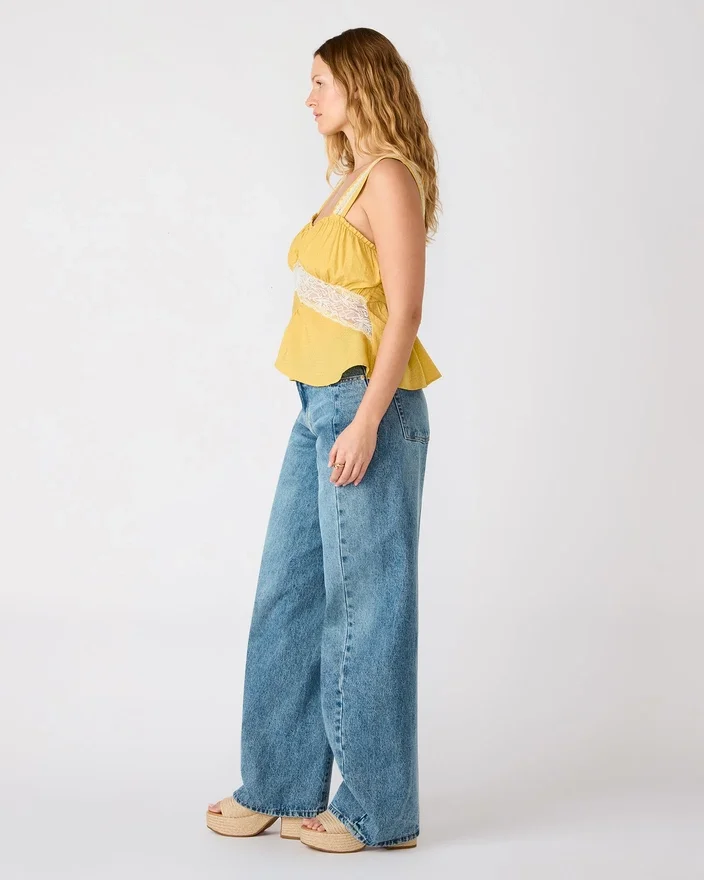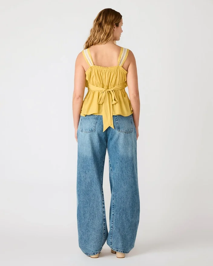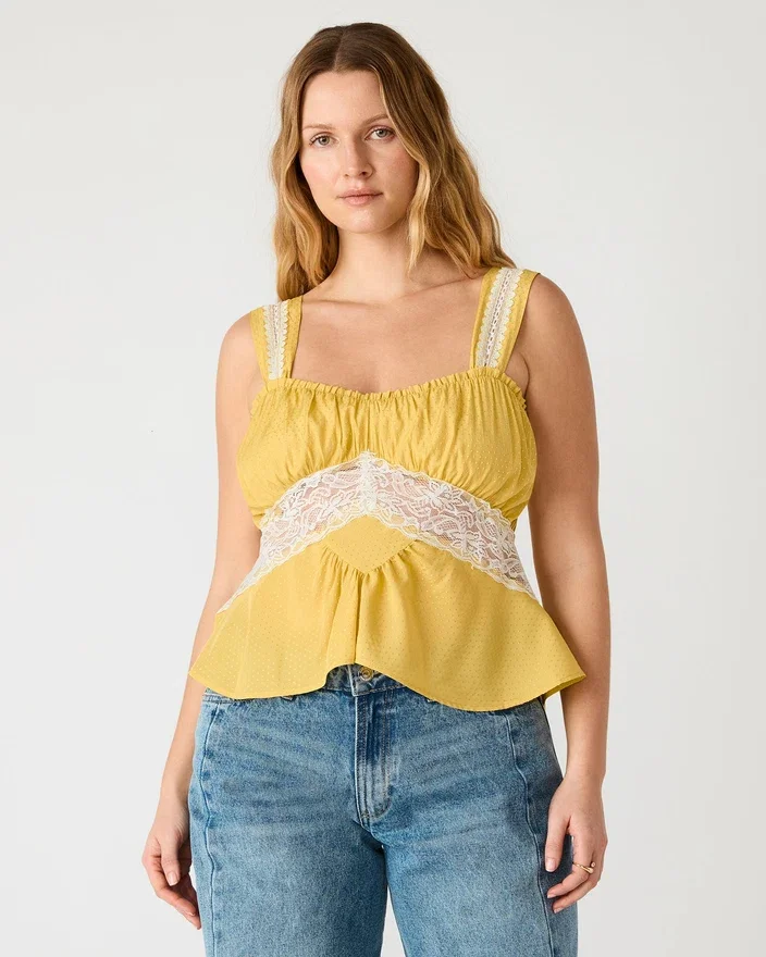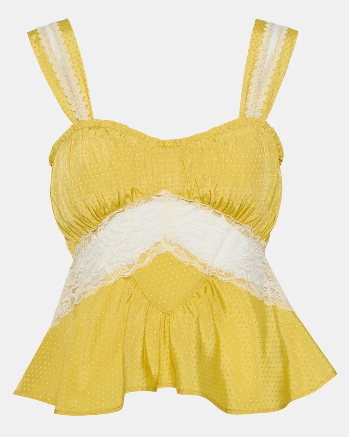 O Top Cinthia Golden Lime oferece sofisticação natural com a sua silhueta sem mangas e o design de conjunto Match. Os delicados detalhes de acabamento em renda conferem uma textura refinada, enquanto um elegante laço decora as costas para um toque final distinto.