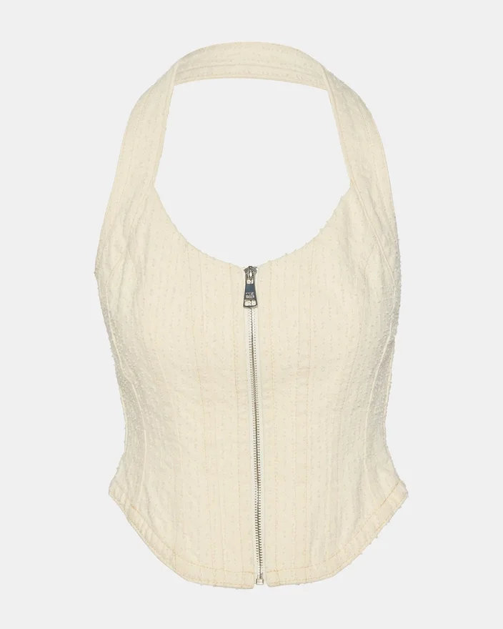O Top Espartilho Natasha Natural apresenta uma silhueta de bustier estruturada com um decote halter lisonjeador que proporciona apoio e definição. O fecho com zíper frontal permite um fácil ajuste e versatilidade, tornando-o ideal para usar em camadas ou como peça de destaque. Confecionado com costura de precisão, este top espartilho oferece um visual elegante e moderno que funciona perfeitamente tanto para o dia como para a noite.