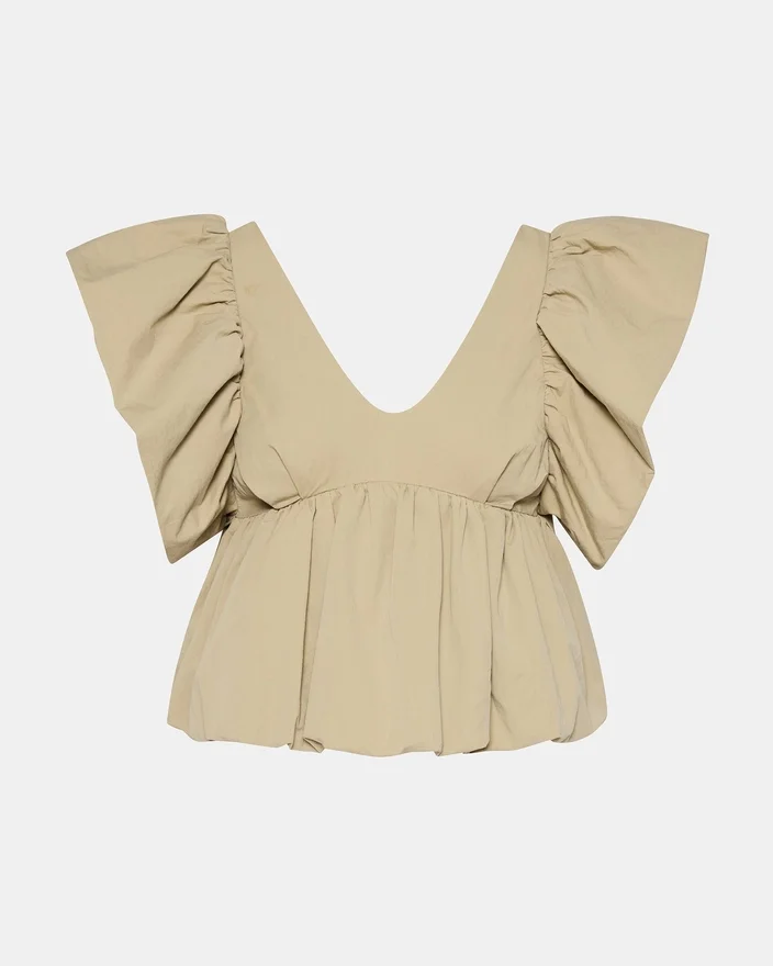 O top Saskya em cáqui apresenta um decote em V lisonjeador, combinado com uma cintura com peplum que confere dimensão e movimento. As mangas com folhos oversized criam um look arrojado e marcante, que transita facilmente do dia para a noite. Perfeito para elevar looks casuais ou para ocasiões especiais.