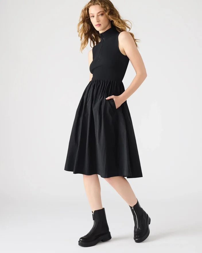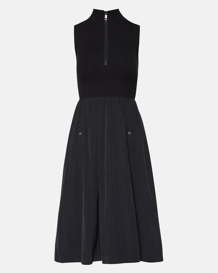 O vestido Berlin é uma adição versátil e chique a qualquer guarda-roupa. Com uma combinação elegante de um top de malha sem mangas e uma saia em linha A de nylon, este vestido de comprimento médio é confortável e na moda. Perfeito para a primavera, apresenta um fecho frontal, gola alta e bolsos com molas para maior funcionalidade. Eleve o seu estilo com este vestido de comprimento médio.