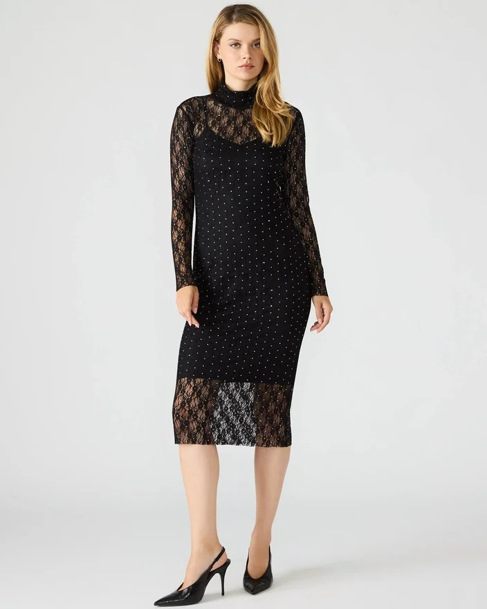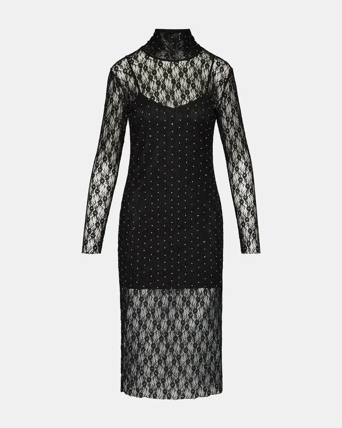 O vestido de renda com tachas Vivienne preto apresenta uma camada exterior de malha transparente forrada, de comprimento médio, com gola alta e mangas com orifícios para os polegares.