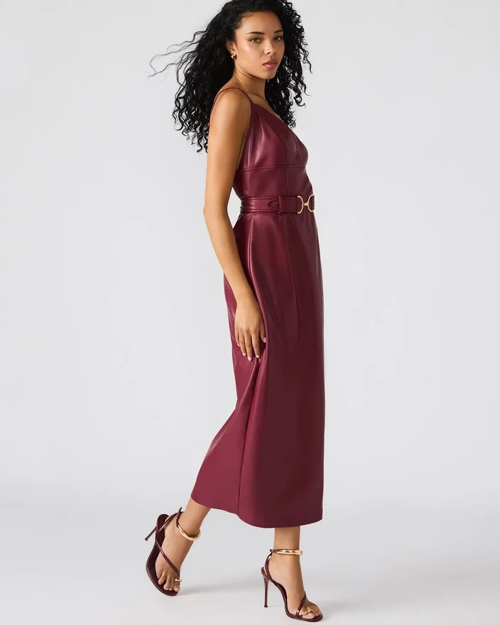 Este vestido midi Kailey Cordovan em imitação de couro apresenta alças ajustáveis para um ajuste personalizado e um fecho de correr nas costas para facilitar o uso. O seu acabamento elegante oferece um visual sofisticado e moderno, ideal tanto para ocasiões diurnas como noturnas. O design sem mangas aumenta a versatilidade, tornando-o uma escolha elegante para usar em camadas ou sozinho.