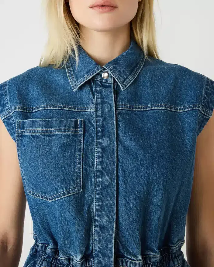 O vestido Robbie em azul Aruba combina a construção intemporal do denim com uma versatilidade moderna. Este modelo sem mangas apresenta um fecho de correr clássico na frente e um decote com gola elegante, conferindo-lhe um aspeto sofisticado. Os bolsos frontais funcionais acrescentam praticidade para o dia a dia. O tecido de denim estruturado garante uma durabilidade prolongada, enquanto a silhueta elegante permite transitar facilmente de ocasiões Casual para ocasiões mais formais.