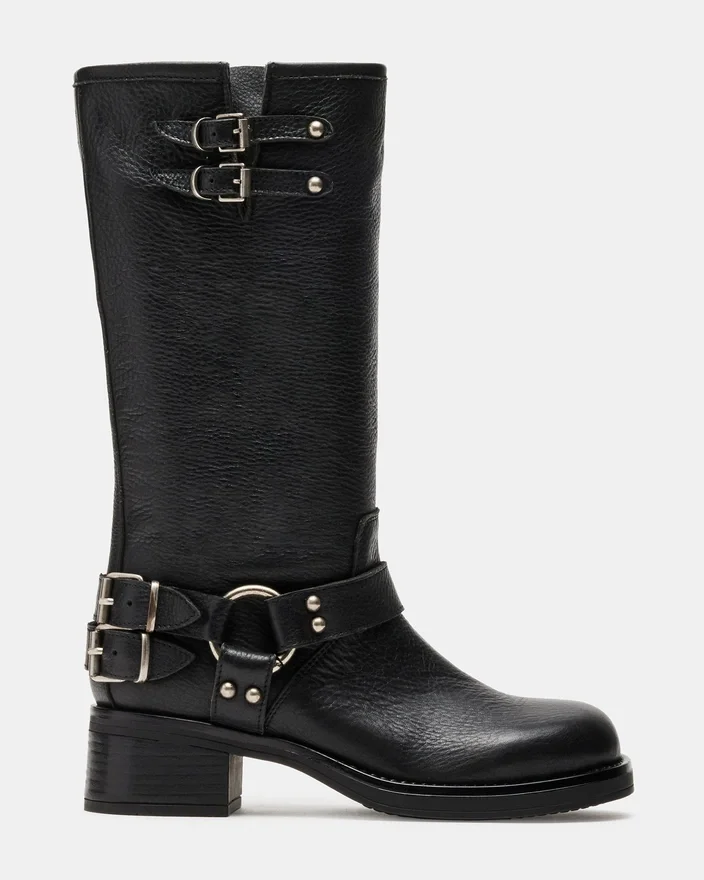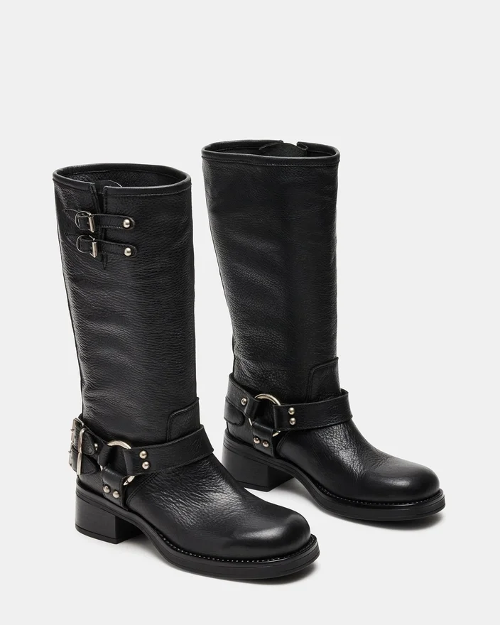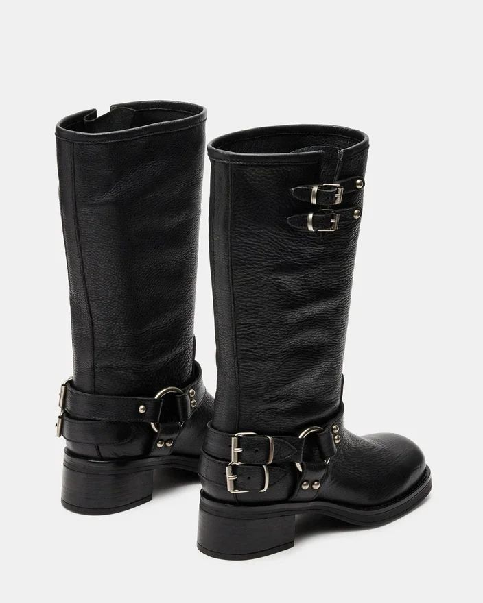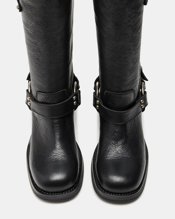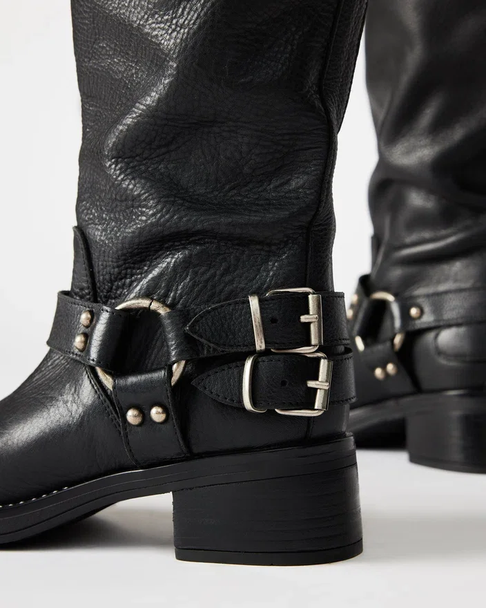 A bota Astor de biqueira quadrada apresenta uma silhueta folgada até meio da barriga da perna, reforçada com detalhes de tiras e fivelas robustas. Uma sola larga com salto em bloco proporciona uma base sólida para este design inspirado nas botas de engenheiro.