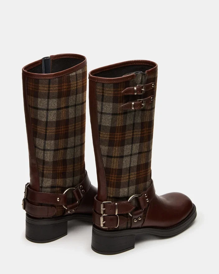 A bota Astor Flannel Brown Multi de biqueira quadrada apresenta uma silhueta folgada até meio da panturrilha, reforçada com detalhes de tiras e fivelas robustas. Uma sola larga com salto em bloco proporciona uma base sólida para este design inspirado nas botas de engenheiro.
