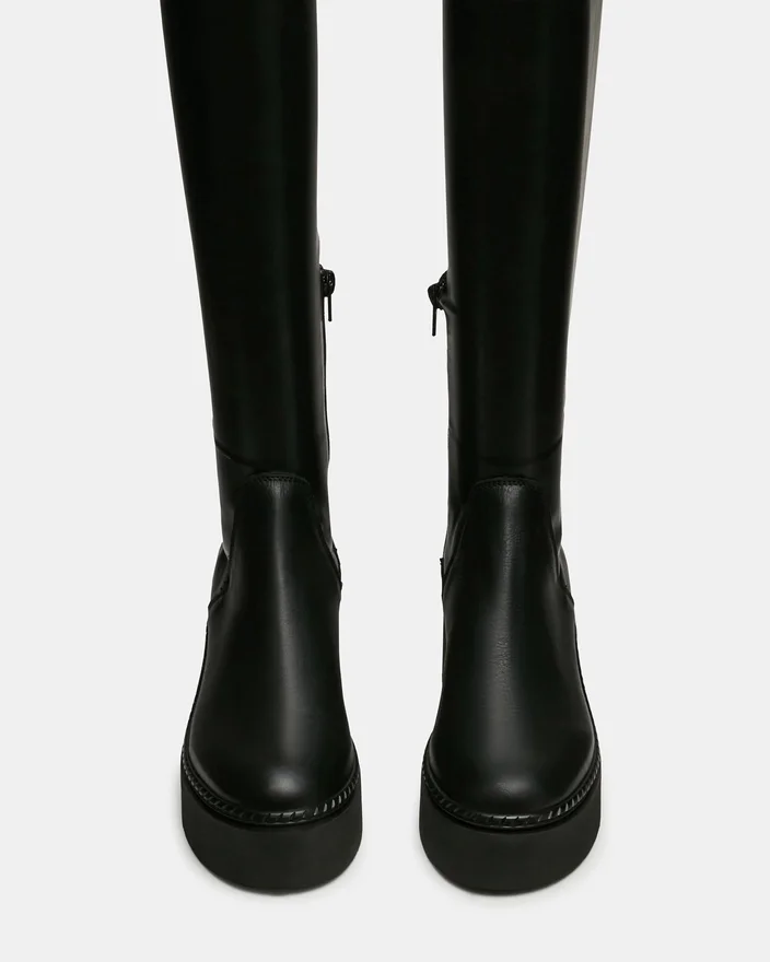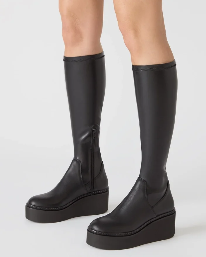 Esta bota de cano alto Draco Black combina um design arquitetónico com funcionalidade prática. A biqueira arredondada cria uma silhueta refinada, enquanto a base em plataforma oferece elevação e maior conforto para uso prolongado. Fabricada com precisão artesanal, proporciona uma estética elegante e um apoio estrutural que valoriza qualquer guarda-roupa.
