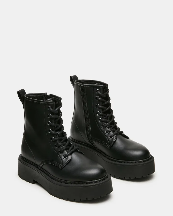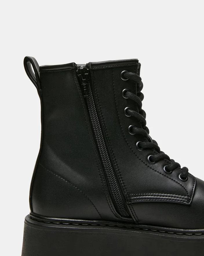 O botin de combate Buffy Black oferece estilo com um toque refinado. Este botin de cano curto com atacadores apresenta uma silhueta estruturada que chama a atenção, quer seja combinado com looks ousados ou com ganga.