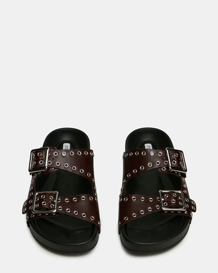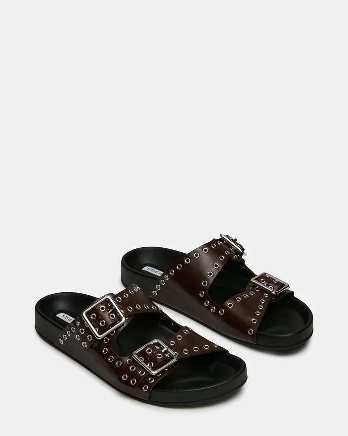 A sandália de couro bordô Abott combina elegância discreta com conforto prático. Detalhes intrincados de ilhós adornam a parte superior, enquanto as fivelas duplas garantem um ajuste personalizável e seguro. A palmilha de apoio foi concebida para uso prolongado, tornando esta uma escolha sofisticada para quem exige estilo e funcionalidade no calçado do dia a dia.
