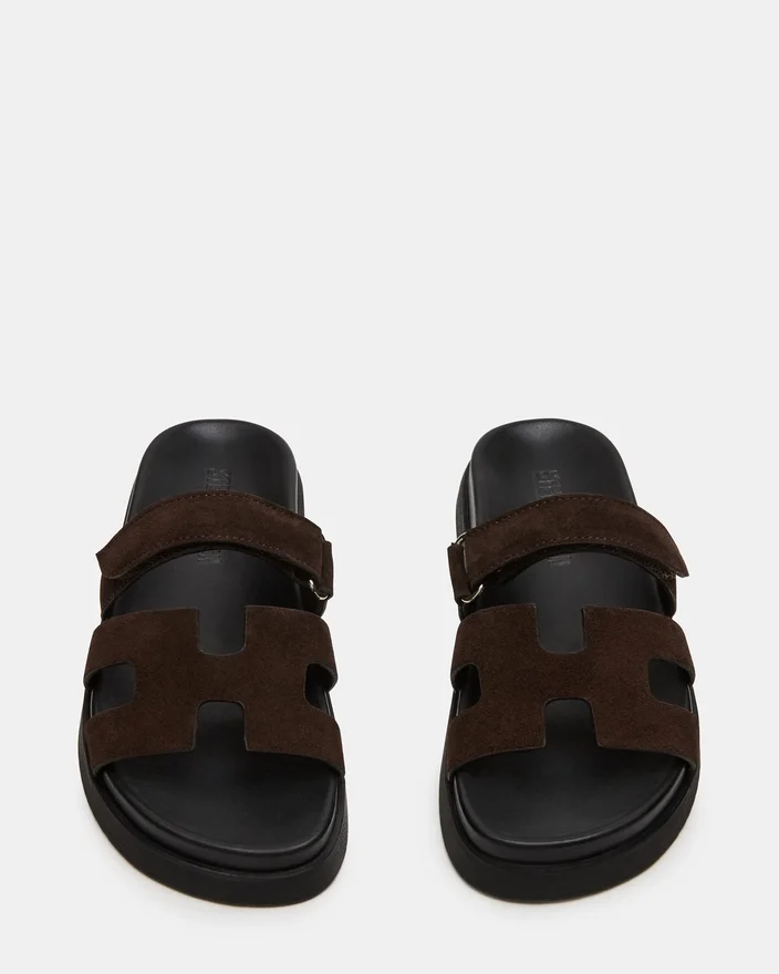 As sandálias Mayven em camurça castanha chocolate apresentam detalhes de construção confortáveis, como uma palmilha moldada, uma sola plana com padrão de piso e uma tira superior ajustável, além de uma tira frontal com um design de recorte geométrico.