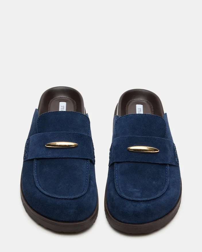 A mules Tobin em camurça azul-marinho apresenta um acabamento suave e um design fácil de usar, fruto de um trabalho artesanal especializado. A sua silhueta versátil garante conforto sem sacrificar o estilo, tornando-a ideal tanto para ambientes casuais como profissionais. A sola plana proporciona um apoio firme, perfeita para usar durante todo o dia.
