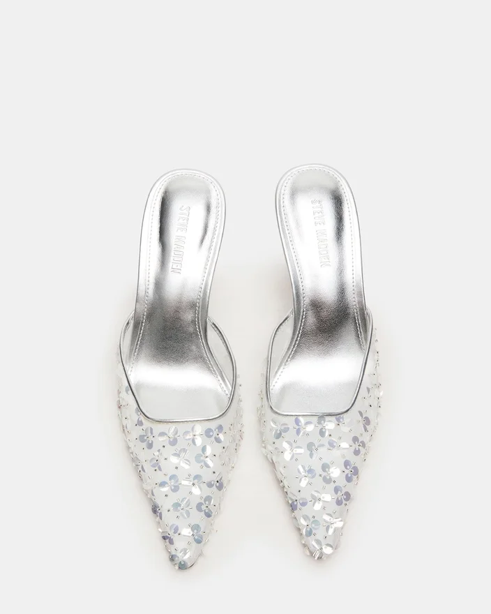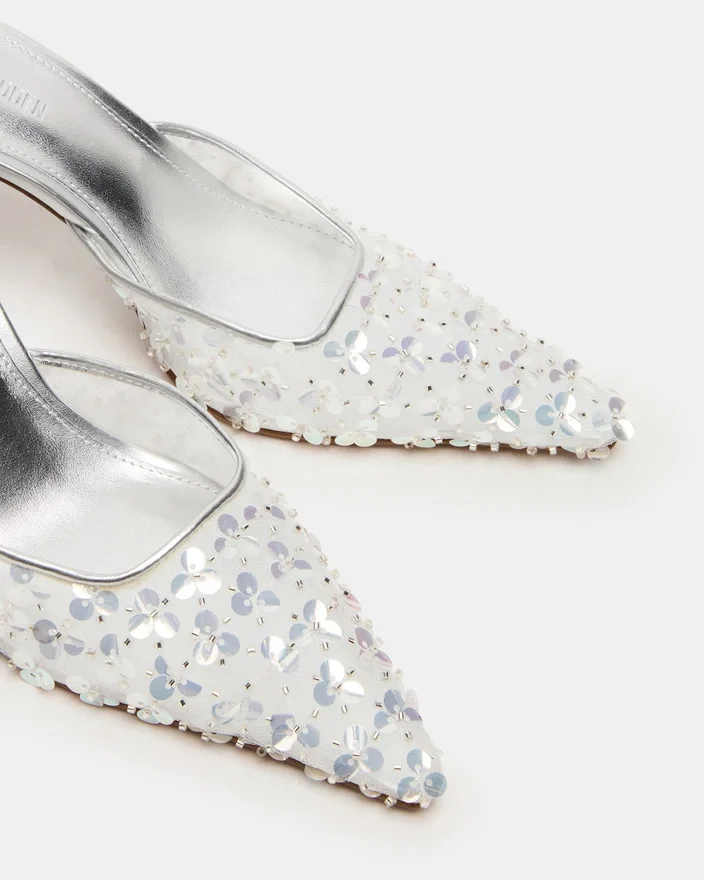 Enriquece a tua coleção de calçado com o Alexi Sequin Silver, uma sofisticada mules de salto alto com biqueira pontiaguda. Confecionado com detalhes de alta qualidade, este modelo versátil combina um estilo contemporâneo com um conforto que permite caminhar com facilidade.