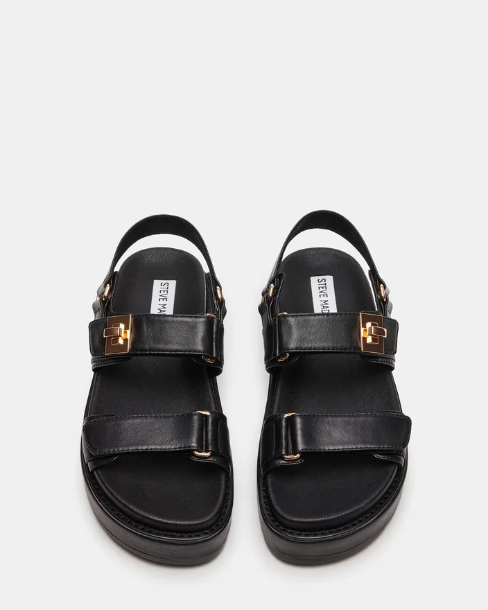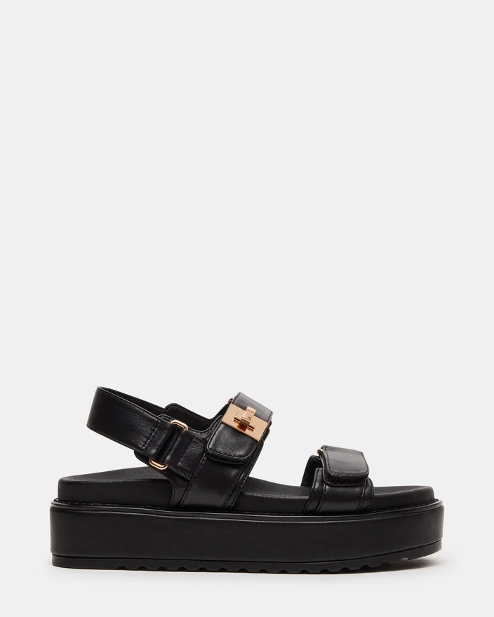 • Sandália Bigmona retoma a sandália Mona com o seu clássico detalhe de fecho giratório e eleva o design sobre uma sola plana robusta para um pouco mais de altura.