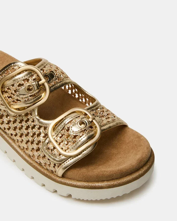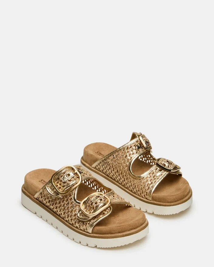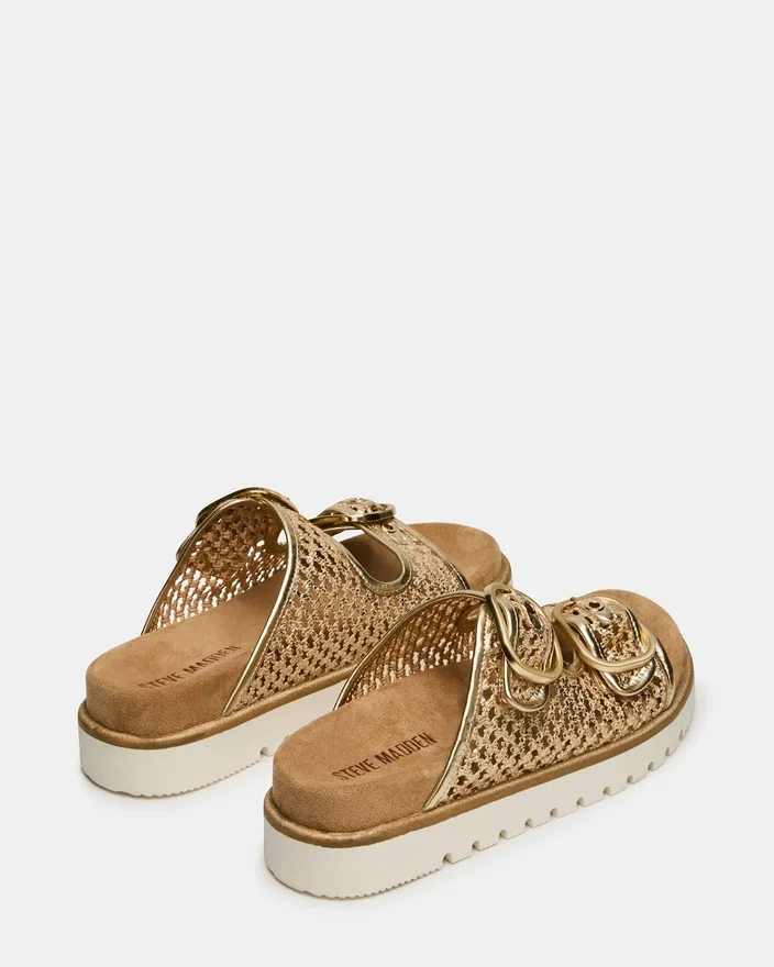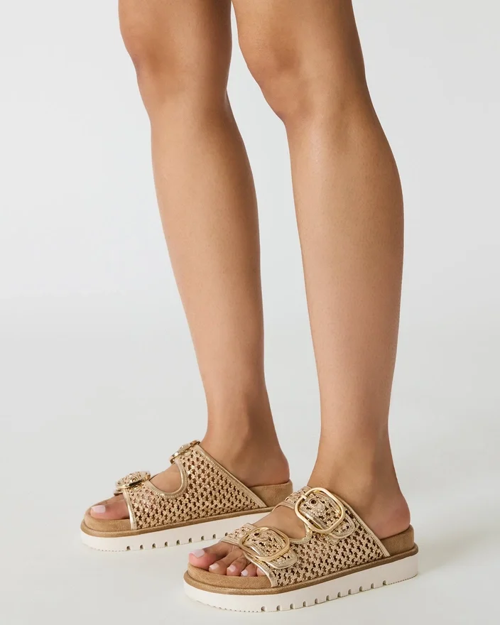 A Shellby Gold é uma sandália tecida habilmente trabalhada, concebida para proporcionar conforto e estilo sem esforço. A silhueta tipo chinelo apresenta fechos de fivela seguros que proporcionam um ajuste regulável e estabilidade ao longo do dia. A palmilha contornada oferece apoio ao arco e amortecimento, tornando esta peça versátil ideal tanto para passeios casuais como para ocasiões descontraídas. A construção tecida proporciona um calçado respirável, perfeito para climas quentes.