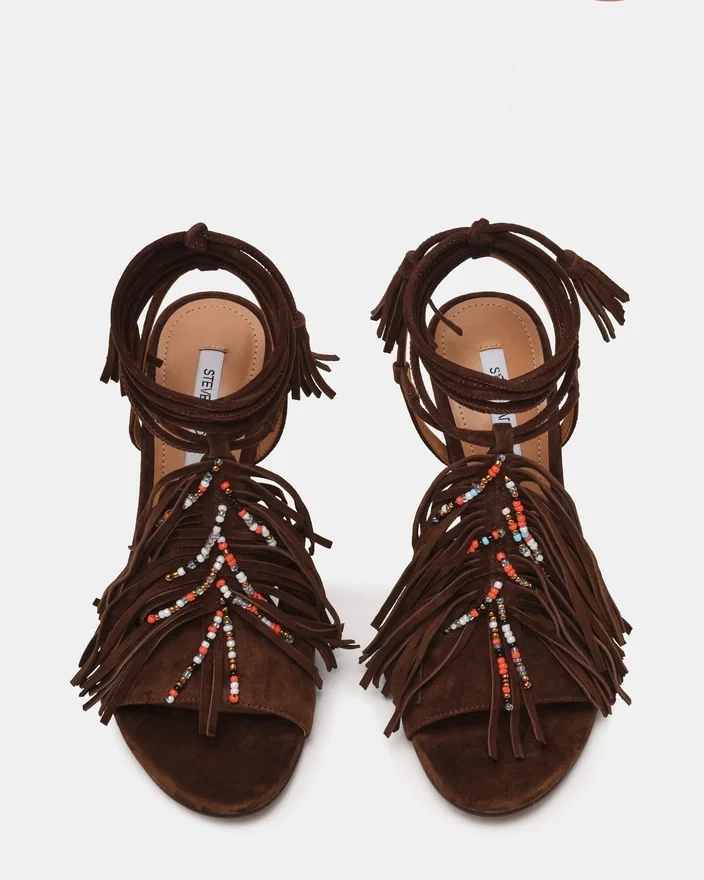 O salto agulha Talia em camurça castanha combina um design arquitetónico com um acabamento luxuoso. O movimento em cascata das franjas confere uma textura dinâmica, complementada por detalhes intrincados em contas que refletem a luz a cada passo. O sapato de salto agulha refinado proporciona elevação e elegância, tornando este modelo uma escolha essencial para quem aprecia o artesanato sofisticado no calçado. Perfeito para ocasiões que exigem um estilo marcante e um acabamento requintado.