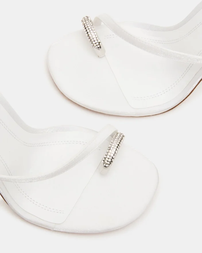 Entre no mundo da moda com os sapatos de salto agulha Tia Rhinestones em cetim branco. Com detalhes ousados em metal dourado e um design com tiras, este sapato vai elevar qualquer look.