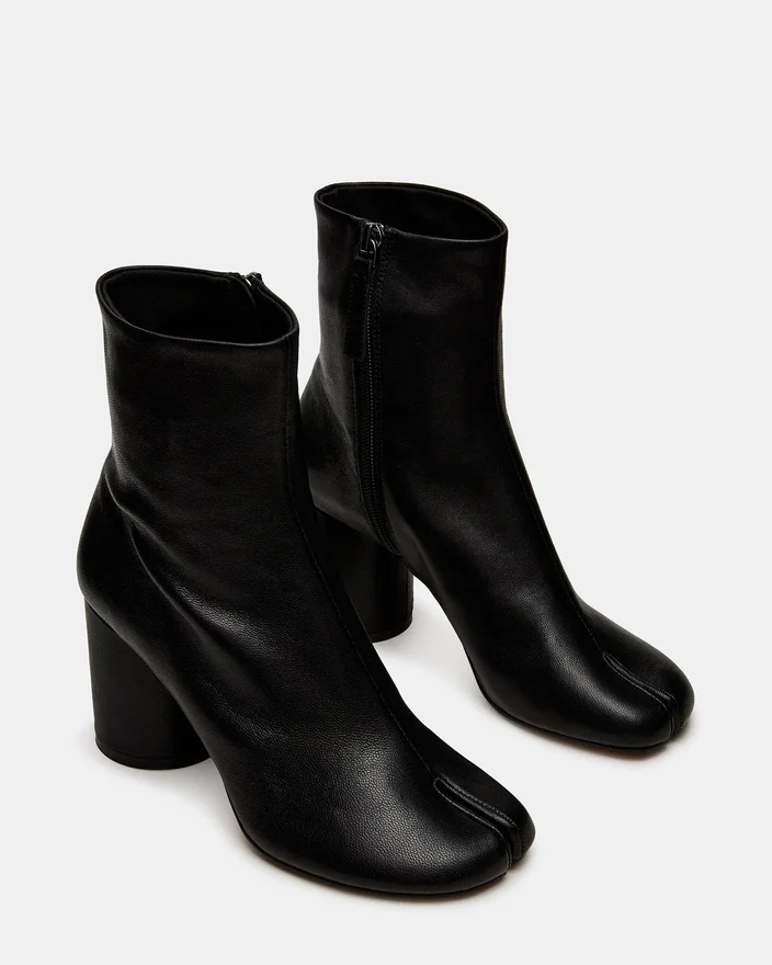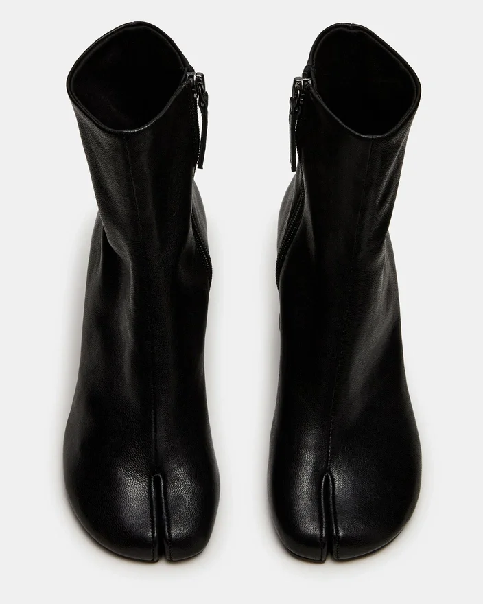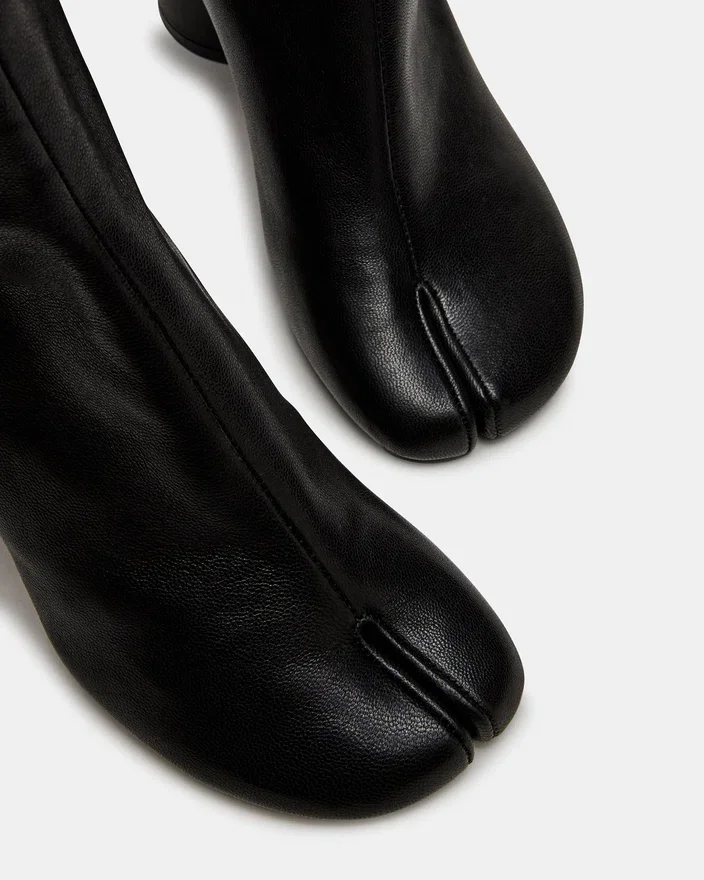 O Caro em couro preto apresenta a silhueta distintiva de Sapatos Tabi com biqueira dividida, oferecendo uma estética moderna com conforto funcional. Um salto em bloco robusto proporciona um apoio estável ao longo do dia, mantendo um perfil elegante. Este botin combina na perfeição um estilo sofisticado com versatilidade para o dia a dia.